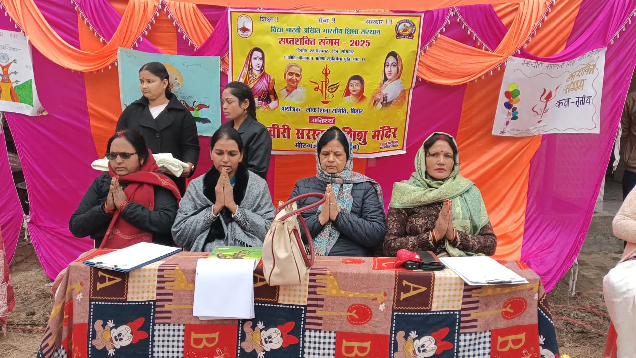 लोकतंत्र न्यूज़,मीरगंज (गोपाललगंज );- महावीरी सरस्वती शिशु मंदिर मीरगंज में सोमवार 22 दिसंबर 2025 को सप्तशक्ति संगम का आयोजन किया गया,जिसकी अध्यक्षता ज्योति देवी ने किया।कार्यक्रम का शुभारंभ सप्तशक्ति संगम की विभाग संयोजिका श्रीमती आशा रंजन,अध्यक्ष श्रीमती ज्योति देवी एवं वरिष्ठ आचार्या श्रीमती सन्नी पाण्डेय ने दीप प्रज्वलित कर किया।मुख्य वक्ता श्रीमती आशा रंजन ने कुटुंब प्रबोधन पर अपना उद्बोधन दिया।वहीं श्रीमती सनी पाण्डेय ने भारत के विकास में महिलाओं की भूमिका पर प्रकाश डाला।विशिष्ट माता का सम्मान रेखा कुमारी,नीलू कुमारी।अनुभव कथन ब्यूटी देवी एवं स्मृति केशरी ने किया। आभार ज्ञापन वंदना शर्मा,संकल्प प्रस्तुति आचार्या सुरुचि वर्मा ने किया।विशिष्ट माता के रूप में मशरूम की खेती से महिलाओं को स्वालंम्बी बनाने वाली रेखा कुमारी एवं दीया निर्माण से महिलाओं को सशक्त बनाने वाली नीलू देवी को दिया गया।प्रधानाचार्या सुनीता राय के मार्गदर्शन में आयोजित कार्यक्रम में प्रबधकारिणी समिति अध्यक्ष श्री पंकज किशोर सिंह,कोषाध्यक्ष श्री विजय कुमार,सचिव श्री ब्रजेश कुमार सिंह,सरस्वती शिशु मंदिर हकाम की प्रधानाचार्या श्रीमती सुमन कुमारी,शिशु मंदिर सरसर के प्रधानाचार्य श्री वीरेंद्र कुमार सिंह,सरस्वती शिशु मंदिर कोयलादेवा की प्रधानाचार्या रिंकू कुमारी,आचार्या सोनी कुमारी सहित अन्य गणमान्य शामिल रहे।मंच संचालन मंजू देवी ने किया।विद्यालय की आचार्या सपना कुमारी,राज नंदनी सोनी,गुंजा कुमारी।प्रधानाचार्य के मार्गदर्शन में सम्पन्न हुए इस सप्तशक्ति संगम कार्यक्रम में करीब 300 माताओं की सहभागिता रही।मुख्य द्वार पर विद्यालय की बहनों द्वारा रोड़ी चंदन एवं पुष्प वर्षा से किया गया।
