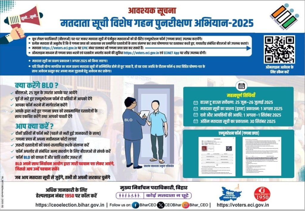 लोकतंत्र न्यूज़ नेटवर्क,सिवान;- 1.भारत का संविधान सर्वोच्च है। सभी नागरिक,राजनीतिक दल और भारत निर्वाचन आयोग संविधान का पालन करते हैं।2. संविधान के अनुच्छेद 326 में मतदाता बनने की पात्रता का उल्लेख है। केवल वे भारतीय नागरिक जो 18 वर्ष या उससे अधिक आयु के हैं और किसी निर्वाचन क्षेत्र में सामान्य रूप से निवास करते हैं, मतदाता बनने के पात्र हैं।3. बिहार में प्रत्येक मतदाता की पात्रता की पुष्टि हेतु सभी राजनीतिक दलों की पूर्ण सहभागिता के साथ विशेष गहन पुनरीक्षण(SIR) सफलतापूर्वक प्रारंभ हो चुका है। 4. भारत निर्वाचन आयोग के पास पहले से ही 77,895 बूथ स्तरीय ऑफिसर (BLO) हैं, तथा नए मतदान केंद्रों के लिए लगभग 20,603 नए BLO नियुक्ति की जा रही है।5.एक लाख से अधिक स्वयंसेवक इस विशेष पुनरीक्षण के दौरान विशेष रूप से वृद्ध, बीमार, दिव्यांग, गरीब और अन्य वंचित समूहों के वास्तविक मतदाताओं की सहायता करेंगे।6. भारत निर्वाचन आयोग में पंजीकृत सभी मान्यता प्राप्त राष्ट्रीय और राज्य स्तरीय राजनीतिक दलों में अब तक 1,54,977 बूथ लेवल एजेंट (बीएलए) नियुक्त कर लिए हैं। वे अभी और बीएलए नियुक्त किए हैं। वे अब भी और अधिक बी एल ए नियुक्त कर सकते हैं7. बिहार के सभी 243 विधानसभा क्षेत्रों में वर्तमान 7,89,69,844 मतदाताओं के लिए नए गणना प्रपत्रों(Enumeration Form-EF)की छपाई एवं घर-घर जाकर वितरण का कार्य बिहार में प्रारंभ हो चुका है। नए गणना प्रपत्रों (ईएफ) को ऑनलाइन भरने की सुविधा भी शुरू कर दी गई है। और यह प्रक्रिया और सफलतापूर्वक चल रही है।8. वर्तमान 7,89,69,844 मतदाताओं में से 4.96 करोड़ मतदाता, जिनके नाम 01.01.2003 की अंतिम गहन पुनरीक्षित मतदाता सूची में है । उन्हें केवल इसकी पुष्टि करनी है, गणना प्रपत्र भरकर जमा करना है।9. सभी प्रमंडलीयआयुक्त और जिला पदाधिकारी विशेष गहन पुनरीक्षण के दौरान के दौरान सभी बीएलओ को पूर्णकालिक रूप से कार्य में लगा रहे हैं। 10. बिहार के 5,74,07,022 पंजीकृत मोबाइल नंबरों पर एसएमएस भी भेजे जा रहे हैं।11. विशेष गहन पुनरीक्षण से संबंधित सभी गतिविधियां निर्धारित कार्यक्रम के अनुसार सुचारू रूप से चल रही है।