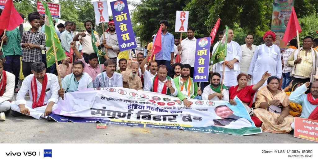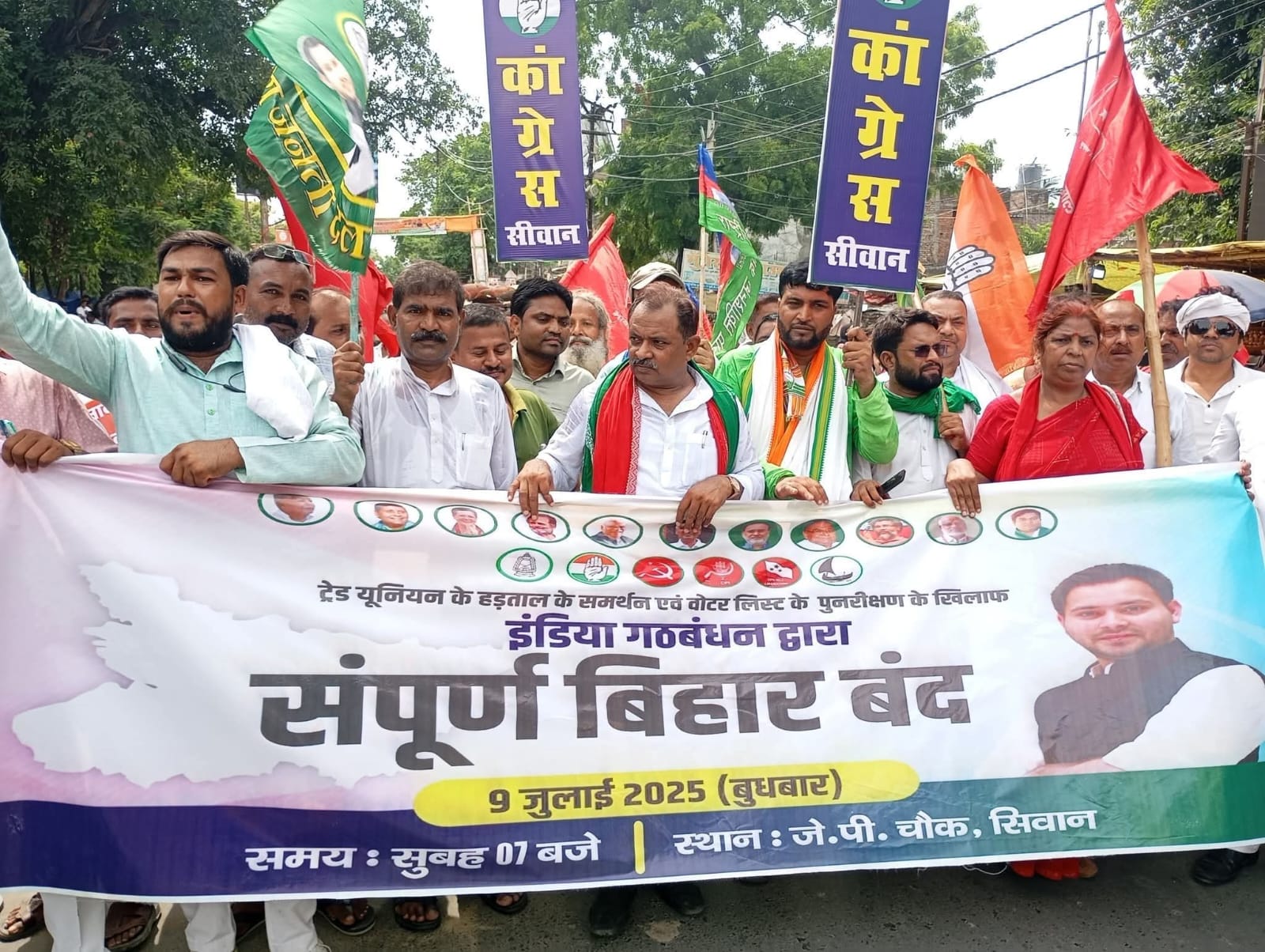 सीवान, 9जुलाई, 2025 :- मतदाता गहन पुनरीक्षण को लेकर इण्डिया गठबंधन के द्वारा बुलाए गए बिहार बंद का सीवान में व्यापक असर रहा। प्रायः सभी सड़कों पर सन्नाटा पसरा रहा। शहर में हर तरफ दुकानें बंद रही। अहले सुबह साढ़े 6 बजे राजद, कांग्रेस, सीपीआई (माले), वीआईपी, सीपीआई, सीपीआई (एम), लोजपा (पारस) के बैनर तले कार्यकर्ता झंडा, बैनर, नारों की तख़्तियों के साथ सबसे पहले शहर के जेपी चौक पर उतर गए। शहर के गोपालगंज मोड़, बबुनिया मोड़, हॉस्पिटल चौक, तरवारा मोड़ पर अलग -अलग टुकड़ियों में जाम लगा दिया।वैशाखी, तरवारा, मालमलिया,भगवानपुर, मदारपुर, मैरवा, गुठनी, बड़हरिया में इण्डिया गठबंधन के कार्यकर्ताओं ने एकजुटता के साथ सड़क पर उतर जाम लगाया।