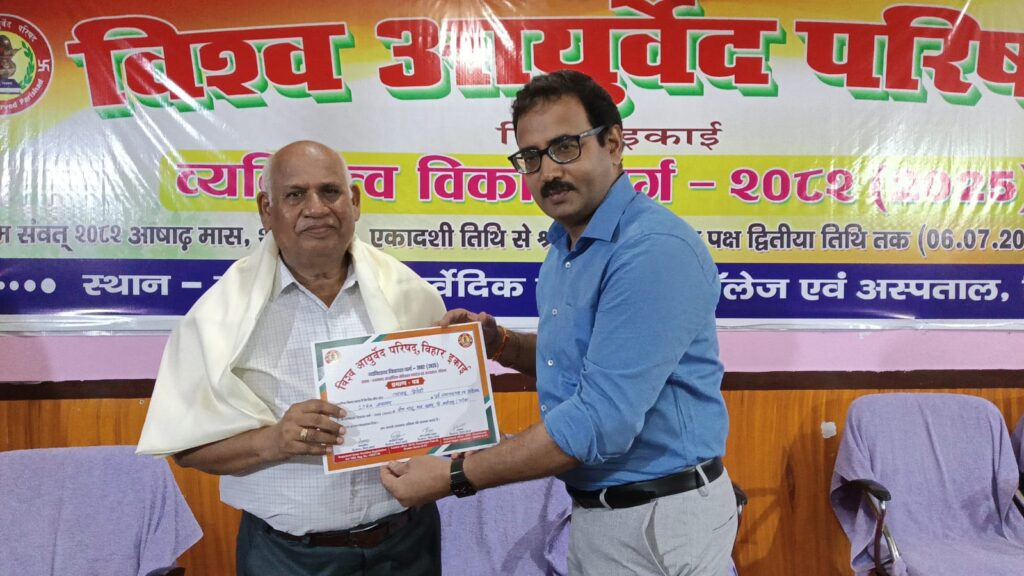 लोकतंत्र न्यूज़ नेटवर्क,सिवान-; विश्व आयुर्वेद परिषद,बिहार इकाई के द्वारा दयानंद आयुर्वेदिक मेडिकल कॉलेज परिसर में आयोजित 7 दिवसीय व्यक्तित्व विकास वर्ग के चौथे दिन बुधवार को धन्वंतरि सभागार में शिविर की विधिवत शुरुआत हुई।दिन की शुरुआत में प्रातः काल छात्रों को योगाभ्यास कराया गया एवं योग कर निरोग रहने के फायदे बताये गये.प्रथम सत्र में वैद्य रामबाबू द्विवेदी एम०डी०, पी०एच०डी०(I.T.R.A.) जामनगर लखनऊ (उ०प्र०) ने सृष्टि की उत्पति विषय पर विस्तृत व्याख्यान दिया।