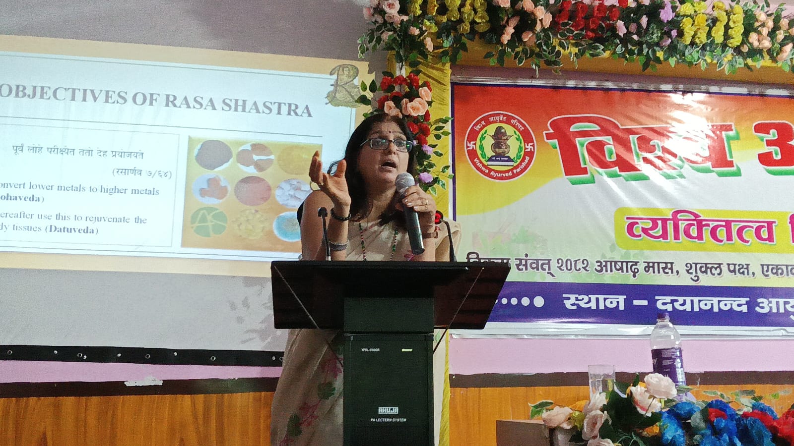 वहीं द्वितीय सत्र में बीएचयु के रस शास्त्र विभाग की विभागध्यक्ष डॉ नम्रता जोशी ने रस शास्त्र पर व्याख्यान दिया।इसके उपरांत विश्व आयुर्वेद परिषद के प्रान्त महासचिव सह दयानन्द आयुर्वेदिक मेडिकल कॉलेज एवं अस्पताल के प्राचार्य डॉ सुधांशु शेखर त्रिपाठी ने वैद्य रामबाबू द्विवेदी को एवं डॉ नम्रता जोशी को अंगवस्त्र प्रतीक चिह्न व पुष्पगुच्छ तथा उपहार देकर सम्मान किया।