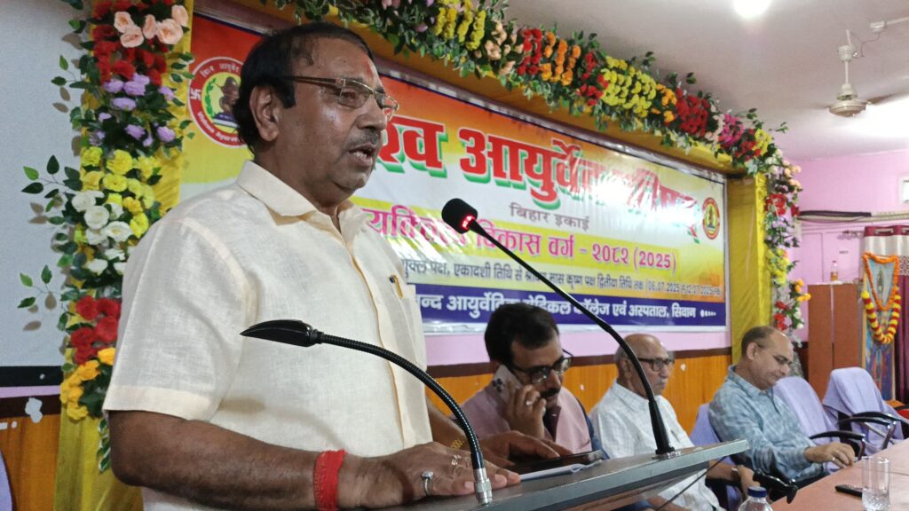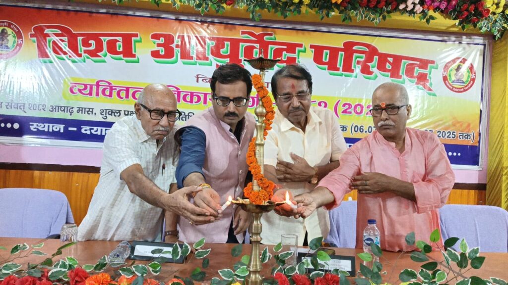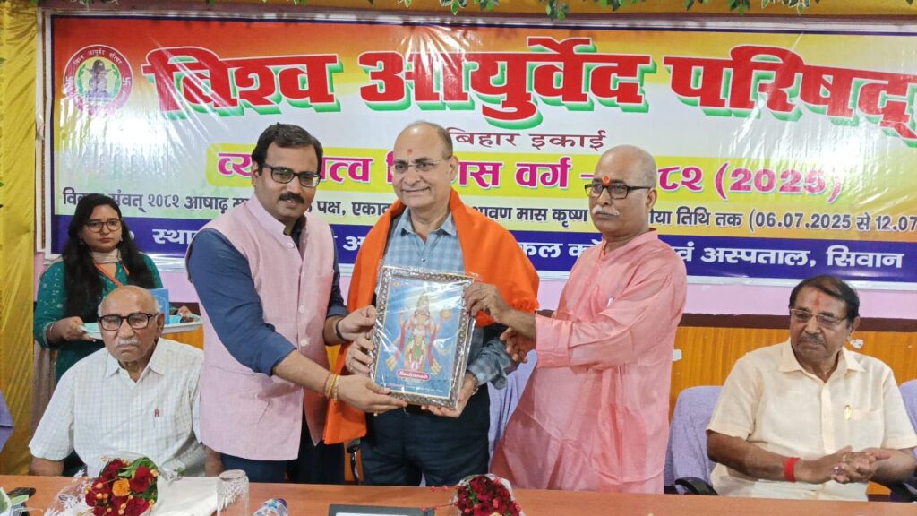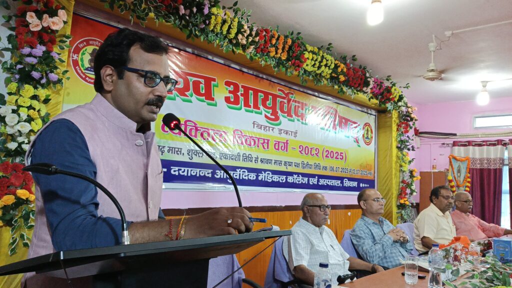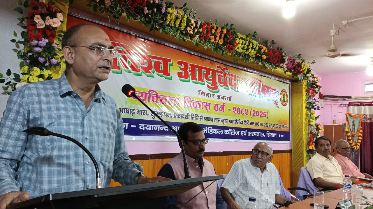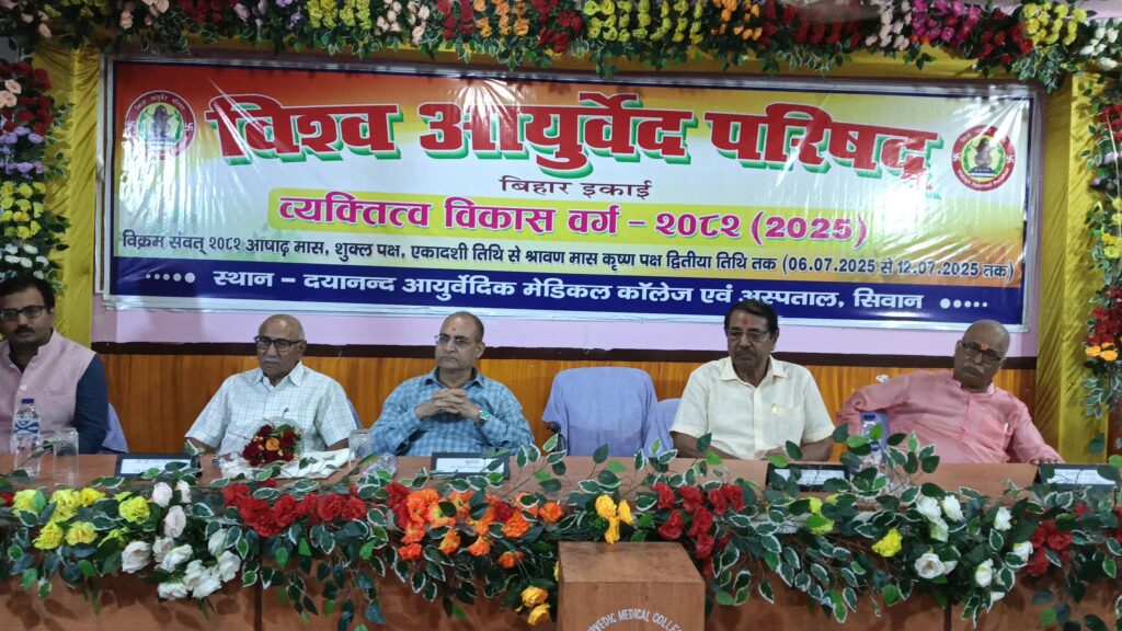 सिवान ;- विश्व आयुर्वेद परिषद,बिहार इकाई के द्वारा दयानंद आयुर्वेदिक मेडिकल कॉलेज परिसर में आयोजित 7 दिवसीय व्यक्तित्व विकास वर्ग के अंतिम दिन शनिवार को समापन सत्र के मौके पर बतौर मुख्य अतिथि जेपी विश्वविद्यालय,छपरा के कुलपति प्रो. प्रमेन्द्र कुमार वाजपेयी,दयानन्द आयुर्वेदिक मेडिकल कॉलेज सिवान पहुँचे जहां उनका भव्य स्वागत किया गया।समापन सत्र का शुभारंभ जेपी विश्वविद्यालय,छपरा के कुलपति प्रो. प्रमेन्द्र कुमार बाजपेयी, विश्व आयुर्वेद परिषद के राष्ट्रीय उपाध्यक्ष वैद्य शिवादित्य ठाकुर,विश्व आयुर्वेद परिषद के प्रांत संरक्षक सह पूर्व प्राचार्य डॉ प्रजापति त्रिपाठी,विश्व आयुर्वेद परिषद के प्रान्त महासचिव सह दयानन्द आयुर्वेदिक मेडिकल कॉलेज एवं अस्पताल के प्राचार्य डॉ सुधांशु शेखर त्रिपाठी,महाविद्यालय के सचिव डॉ रामानन्द पांडेय ने संयुक्त रूप से दीप प्रज्वलित कर एवं भगवान धन्वंतरि के तैलचित्र पर पुष्पांजलि अर्पित कर किया। व्यक्तित्व विकास वर्ग