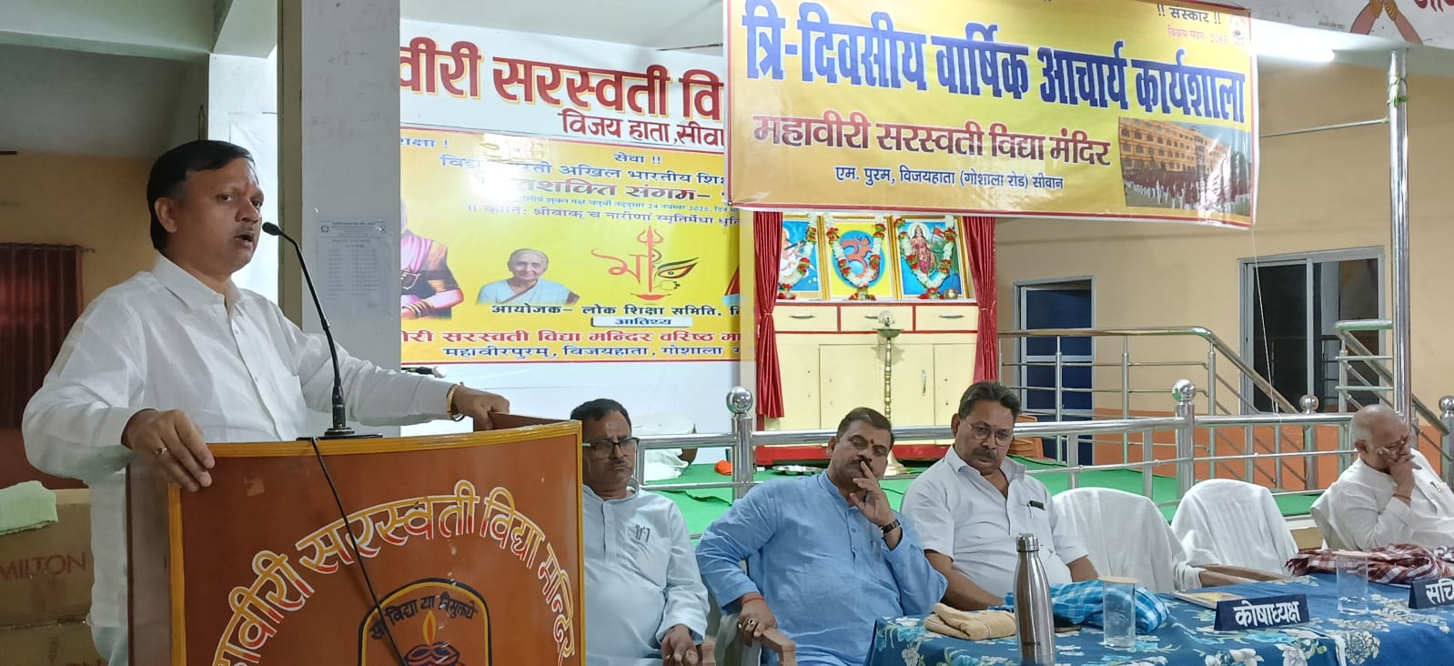 लोकतंत्र न्यूज,सिवान ;- स्थानीय विद्या भारती विद्यालय, महावीरी सरस्वती विद्या मंदिर,विजयहाता में आगामी सत्र 2026-27 की दृष्टि से आयोजित आचार्य कार्यशाला के तृतीय दिवस के समापन सत्र में सीवान विभाग के निरीक्षक अनिल कुमार राम, विद्यालय प्रबंधन समिति के संरक्षक प्रो रविन्द्र पाठक, अध्यक्ष डॉ शरद चौधरी, सचिव प्रो शंभुनाथ प्रसाद, कोषाध्यक्ष जीव नारायण, सहसचिव ओमप्रकाश सिंह, प्राचार्य डॉ कुमार विजय रंजन तथा प्रभारी प्राचार्य डॉ आशुतोष कुमार की उपस्थिति में त्रि-दिवसीय आचार्य कार्यशाला का अंतिम एवं समापन सत्र संपन्न हुआ। दीप्रज्ज्वलन एवं वंदना के उपरांत सभी अधिकारियों का परिचय एवं सम्मान कराते हुए महावीरी विजयहाता के प्राचार्य डॉ कुमार विजय रंजन ने कार्यशाला के सभी सत्रों का संक्षिप्त वृत्त प्रस्तुत किया। इसके पूर्व आज तृतीय दिवस का आरंभ प्रातःकालीन शारीरिक एवं योग सत्र से हुआ। आचार्य जीऊत चक्रवर्ती तथा वंदना प्रमुख मुरली मनोहर मिश्र ने आचार्यों को महावीरी विजयहाता के योग हॉल में योगाभ्यास एवं प्रातःस्मरण कराया। आज के प्रथम सत्र में विद्यालय व्यवस्थाओं के सुचारू संचालन के लिए नवीन सत्र की ‘आचार्य भारती’ का गठन किया गया। इस दृष्टि से विद्यालय व्यवस्था से संबंधित विभिन्न विभागों के प्रमुख एवं सहायक आचार्य बंधु-भगिनी मनोनीत किए गए। । द्वितीय सत्र में आचार्य नियमावली सौंपते हुए उसके प्रावधानों आदि पर प्राचार्य डॉ रंजन ने आचार्यों के साथ परिचर्चा की। तृतीय सत्र में संस्कृति बोध परियोजना तथा सभी कक्षाओं की शैक्षणिक उपलब्धियों पर कल हुई समीक्षात्मक चर्चा आगे बढ़ाई गई तथा विद्यालय के कक्षाखंडों को लेकर नवीन कक्षाचार्यों तथा दिवसाधिकारियों को नवीन सत्र में दायित्व प्रदान किए गए। अंतिम एवं समापन सत्र में विद्यालय प्रबंधन समिति के ऊपर्युक्त अधिकारियों के साथ आचार्य बंधु-भगिनी का मुक्त चिंतन सत्र हुआ जिसमें विद्यालय की भौतिक आवश्यकताओं, आचार्यों के लिए आवश्यक सुविधाओं आदि को लेकर आचार्य बंधु-भगिनी ने अपने विचार रखे। राष्ट्रीय शिक्षा नीति एवं समाज की वर्तमान चुनौतियों तथा अभिभावकों की अपेक्षाओं के अनुरूप महत्वपूर्ण शैक्षणिक बिंदुओं को रखते हुए अध्ययन-अध्यापन करने के लिए सुविधाएँ बढ़ाने का आग्रह किया। प्रबंधन समिति ने इन सभी बिंदुओं पर संज्ञान लेते हुए यथासंभव सहयोग का आश्वासन दिया। मीडिया प्रभारी अखिलेश श्रीवास्तव एवं आचार्य प्रवीण चन्द्र मिश्र ने बताया कि यह कार्यशाला अपने लक्ष्यों को पूरा करने के संकल्प के साथ शांति मंत्र द्वारा संपन्न हुई।